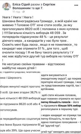 «Якщо я не помиляюся то кандидат має набрати 51%, для того щоб очолити громаду», - пише Еліса Сідей.