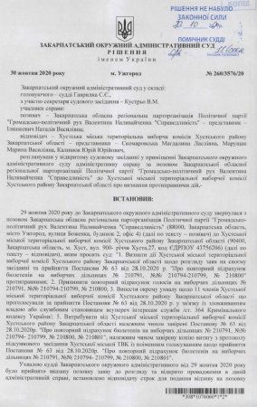 Як повідомляє громадський правозахисник Віталій Грегор, 30 жовтня суддя Закарпатського окружного адміністративного суду С.Гаврилко визнав протиправною та скасував постанову Хустської ТВК № 63 від 28.10.2020 р. «Про повторний підрахунок бюлетенів на виборчих дільницях № 210791. №№ 210794- 210799, № 210800». Однак дане рішення було оскаржено до апеляційної інстанції, тому формально не набуло законної сили.