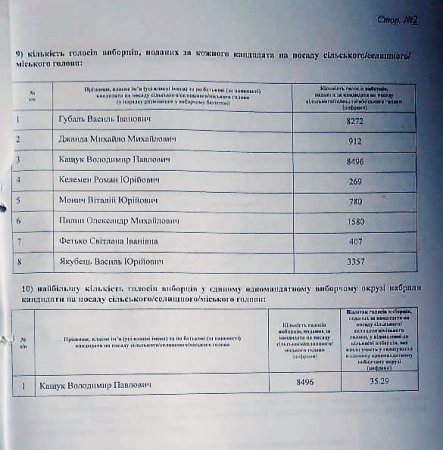 За протоколом Хустської ТВК, Володимир Кащук виграв вибори голови Хустської ОТГ набравши - 8496 голоси виборців, на другому місці представник партії Слуга народу Василь Губаль -8272 голоси.