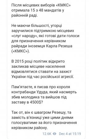За його словами, після місцевих виборів КМКС "Партія угорців України" отримала 15 з 48 мандатів у Берегівській районній раді. Не маючи більшості, угорці заручилися підтримкою місцевих "слуг народу", які нібито готові проголосувати за призначення іноземця Карла Резеша керівником райради.