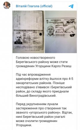 Перед укрупненням Берегівського району лунали застереження щодо створення так званого "угорського району". Про це у своєму телеграмі повідомив журналіст Віталій Глагола.