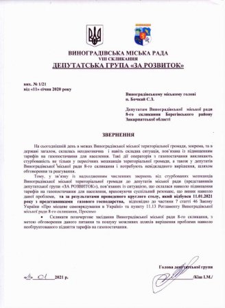 Водночас депутати групи «За розвиток» ініціювали скликання позачергової сесії Виноградівської міської ради. Її мета – обговорити гостре «газове» питання і знайти можливі шляхи вирішення проблеми навколо необґрунтованого підняття тарифів на газопостачання.