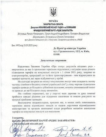 13 січня депутати Мукачівської міської ради від фракціїї «Рідне Закарпаття» звернулись Прем'єра терміново втрутитися у ситуацію щодо різкого підвищення тарифів на комунальні послуги з 1 січня 2021 року, зокрема на електроенергію, природний газ та його транспортування. У зверненні йдеться: « На сьогодні витрати на оплату комунальних послуг вже складають значну частину сімейного бюджету кожної української сім’ї, а тому чергове підвищення тарифів приведе до більшого зубожіння населення, знизить споживацький попит та приведе до ще більшого спаду економіки. Ми глибоко переконані, що у скрутні часи держава та уряд повинні приймати швидкі рішення для підтримки населення та вчасно реагувати на нагальні проблеми громадян.