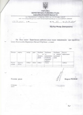 До речі,нами підготовлено та направлено звернення до Національного агентства України з питань державної служби та до Національного агентства з питань запобігання корупції щодо законності сумісництва депутата Виноградівської міської ради п.Костелеба-Веремчук Н.Ю. та радника голови Берегівської районної ради ,адже дана посада входить до складу виконавчого апарату районної ради.
