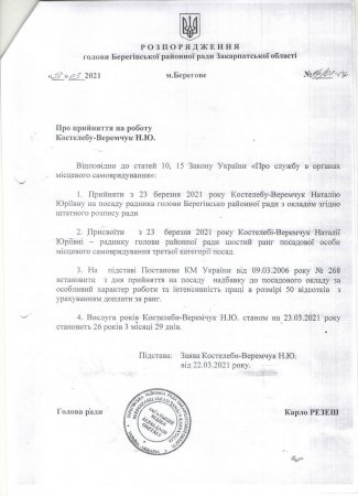23 березня 2021 року пані Наталія розпорядженням голови Берегівської районної ради №14/01-04 прийнята на посаду радника Берегівської районної ради з окладом згідно штатного розпису.