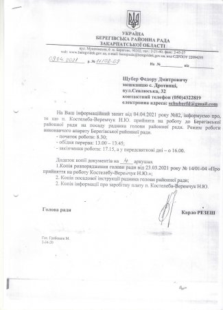 Я звернувся до Виноградівського міського голови п.Бочкай С.З. щоб надав інформацію на усний депутатський запит щодо надання службового приміщення п.Костелеба-Веремчук Н.Ю. і чи здійснює вона виконання службових обов"язків в статусі радника голови Берегівської районної ради в приміщенні міської ради.