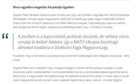 «Ми продовжимо покращувати відносини в майбутньому, але довелося прокласти деякі червоні лінії, тому Угорщина продовжуватиме блокувати засідання комітету Україна-НАТО. Прикро, що ця міжнародна спільнота прощає дії України проти національних меншин» – заявив міністр закордонних справ Угорщини Пейтер Сіярто.