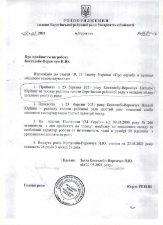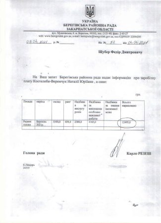 Шляхом проведення відеозапису та опитування посадових осіб Берегівської районної ради з"ясовували наявність на роботі посадових осіб райради в тому числі п.Костелеба-Веремчук Наталії Юріївни,яка згідно штатної розпису працює (чи рахується) головним спеціалістом загального відділу Берегівської районної ради,але ми так і не знайшли її на робочому місці.