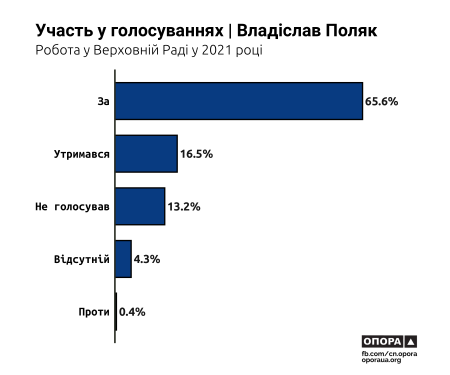 Щодо персональної статистики, то найчастіше натискав кнопку “за” Владіслав Поляк (65% голосувань), найчастіше “утримувався” і голосував “проти” Михайло Лаба (майже 49% та 9,4% випадків відповідно). Натомість Роберт Горват протягом 2021 року жодного разу не натиснув кнопки “проти”.
