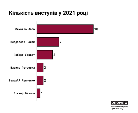 Протягом 2021 року, згідно з даними Верховної Ради України, виступали всі закарпатські мажоритарники. Загалом вони провлели 35 виступів загальною тривалістю майже 16 хвилин. Втім, лише 15 виступів були змістовними. Йдеться про двох парламентарів — Михайла Лабу та Роберта Горвата. Натомість Віктор Балога, Валерій Лунченко, Василь Петьовка та Владіслав Поляк, беручи слово, передавали право виступу іншим депутатам.