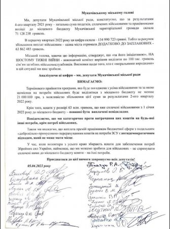 Депутати Мукачівської міської ради звернулися до мера з вимогою не піаритися на війні, а прийняти рішення про реальну допомогу військовим.