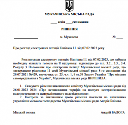 Вчора, на черговій сесії Мукачівської міської ради повинно було розглянуто питання скасування рішення виконавчого комітету Мукачівської міської ради від 26.01.2023 №34 «Про встановлення тарифів на послуги централізованого водопостачання та централізованого водовідведення».