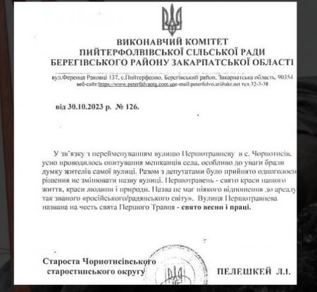 «Етнічно українське село Чорнотисів, що в майже цілком Пийтерфолвівській угорськомовній громаді на Закарпатті,відмовилося перейменовувати вулицю Першотравневу. На жаль, це доволі розповсюджена історія, коли вулиці з такою назвою громади хочуть лишити. Але все одно вони всі будуть перейменовані в рамках деколонізаційного закону. Не ними, так головами обласних адміністрацій» - йдеться в повідомленні Декомунізація. Україна.