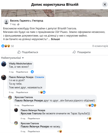 На Закарпатті розгорілася суперечка навколо будівництва магазину, у яку ніби залучений місцевий журналіст та депутат Ужгородської міськради Віталій Глагола . У своєму пості у Facebook він різко відреагував на звинувачення, які висунув його колега Василь Гаджега. Останній стверджує, що Глагола є співвласником будівництва магазину на 72 квадратних метри, яке ведеться на землі, оформленій із порушенням закону.