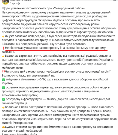 «Цей законопроєкт безперечно містить необхідні для воєнного часу цілі — від посилення вітчизняного ОПК до створення нових робочих місць у громадах. Але залишаються ризики — зокрема, щодо можливих зловживань на місцях. Тому дуже важливо, аби влада діяла прозоро й у тісній взаємодії з громадами, не допускаючи порушення прав жителів Ужгородщини».