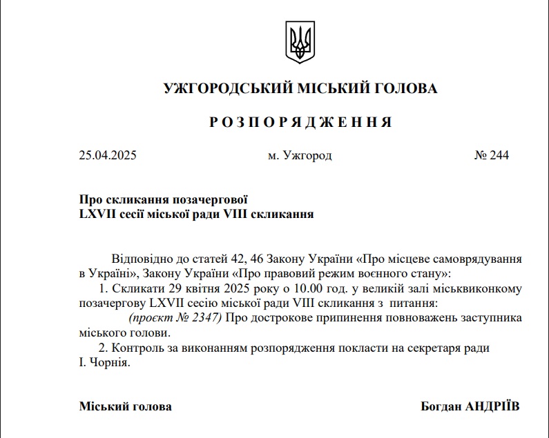 Згідно з оприлюдненим документом, рішення про звільнення Павлайка мають розглянути на найближчій сесії міської ради. Підставою для такого кроку став лист Управління Служби безпеки України в Закарпатській області від 28 березня 2025 року.