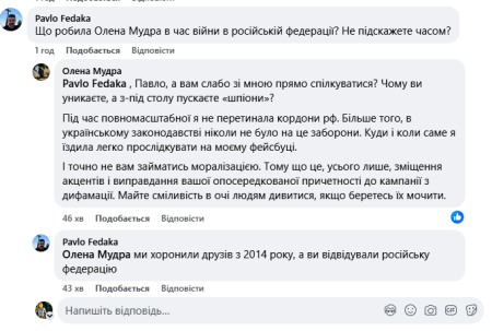 У коментарі до допису Олени Мудрої на її сторінці у соціальній мережі Facebook, Павло Федака написав: "Що робила Олена Мудра в час війни в російській федерації? Не підскажете часом?" Це питання викликало широкий резонанс та жваве обговорення серед користувачів.