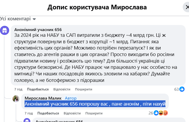 Скептичні настрої щодо антикорупційних органів посилюються на фоні загальнонаціонального розчарування в боротьбі з хабарництвом. Проте авторка ініціативи реагує на подібні дописи емоційно й жорстко.