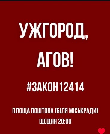 Ужгород, агов! У соціальних мережах поширюється заклик приєднатися до щоденних мирних протестів, ініціаторкою яких є громадська активістка Мирослава Малик. Акції відбуваються щодня о 20:00 на Поштовій площі біля міськради.
