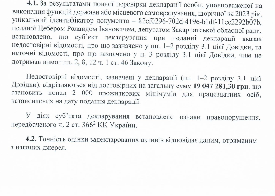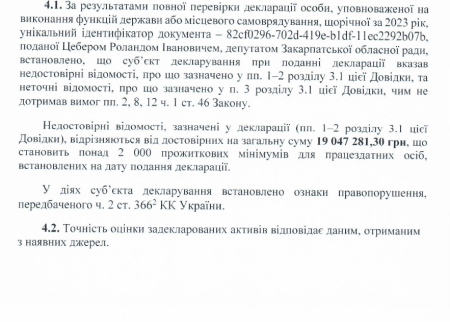 Національне агентство з питань запобігання корупції (НАЗК) завершило повну перевірку щорічної декларації за 2023 рік, поданої депутатом Закарпатської обласної ради Роландом Цебером.