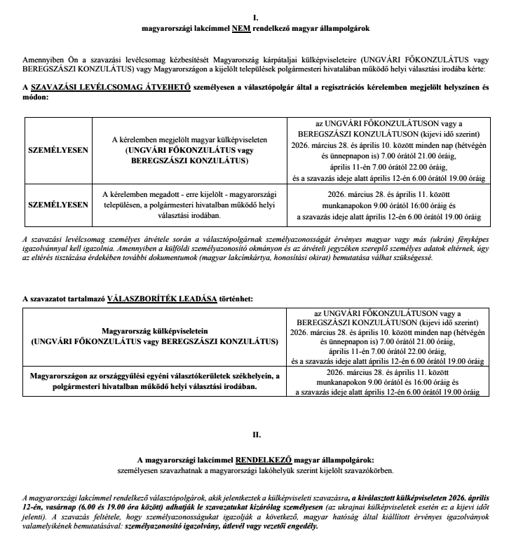 У неділю, 12 квітня 2026 року, відбудуться вибори до Державних зборів Угорщини. Для закарпатських угорців, які мають право голосу, процедура отримання бюлетенів та подання голосів відрізняється залежно від місця реєстрації. Оприлюднено офіційний графік роботи Генеральних консульств в Ужгороді та Берегові.