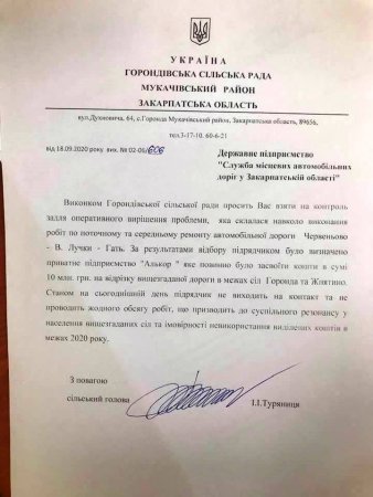Виконком Горондівської сільської ради просить Вас взяти на контроль задля оперативного вирішення проблеми,яка склалася навколо виконання робіт по поточному та середньому ремонту автомобільної дороги Червеньово- В.Лучки – Гать. За результатами підбору підрядчиком було визначене приватне підприємство «Алькор» яке повинно було засвоїти кошти в сумі 10 мільонів гривень на відрізку вищезгаданої дороги в межах сіл Горонда та Жнятино. Станом на сьогоднішнії день підрядчик не виходить на контакт та не проводить жодного обсягу робіт, що приводить до суспільного резонансу населення вищезгаданих сіл та ймовірності невикористання виділених коштів в межах 2020 року.