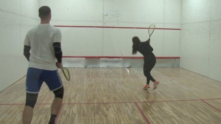 Ужгородець Віктор Ватаг розминається і одночасно проходить інструктаж зі сквошу з тренером. Хлопець уперше пробує себе в грі: "Гра дуже динамічна, цікава, але насправді дуже важка. Уже можу сказати ноги отримали навантаження, щодо рук, то навантаження невелике, але от ноги працюють дуже інтенсивно".