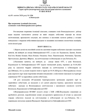 Рішенням сесії міської ради Виноградова, селам які увійдуть у Виноградівське ОТГ дозволено вивезення сміття на сміттєзвалище міста.