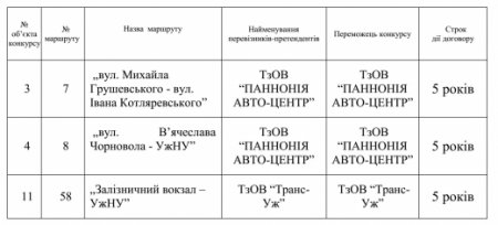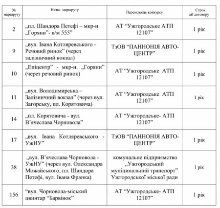 Враховуючи неповну відповідність умовам конкурсу, які визначені виконавчим комітетом Ужгородської міської ради, договори з перевізниками на обслуговування 8 маршрутів укладатимуть тільки на 1 рік. Лише на 3 маршрути пропозиції перевізників відповідали умовам конкурсу і з цими перевізниками договори укладуть на 5 років (деталі – на фото)