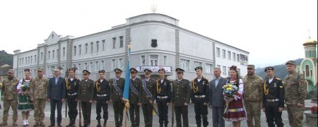 Малий герб встановили на будівлі, де проголосили створення Карпатської України, розповів заступник командира 128-ї окремої гірсько-штурмової бригади Євген Бондар.