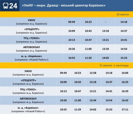 Напередодні та 1 листопада у День пам'яті померлих, відповідно до рішення виконкому, перевізники збільшать кількість автобусів та рейсів до міського цвинтаря «Барвінок» і скоротять інтервал руху – щоб ужгородці змогли відвідати могили рідних та близьких.