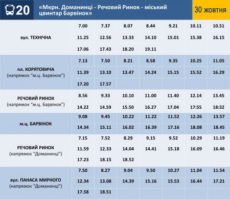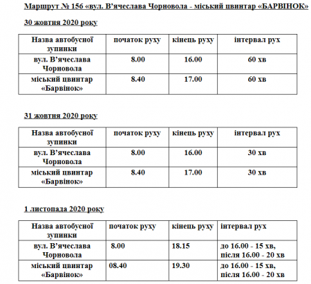 30, 31 жовтня та 1 листопада 2020 року кількість автобусів, які курсують до міського цвинтаря „Барвінок”, буде збільшено (графік)