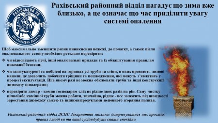 Рахівський РВ ДСНС Закарпаття нагадали жителям району що зима вже близько, а це означає що час приділити увагу своїй системі опалення, докладна інформація у рамці: