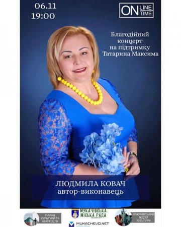 Цієї п’ятниці, 6 листопада, у Мукачеві в Палаці культури та мистецтв відбудеться перший благодійний онлайн-концерт Людмили Ковач в підтримку учня 13-ої школи Максима Татарина, інформує пресслужба міськради.