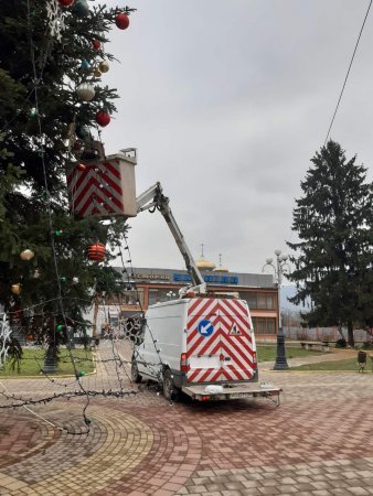 Прикрашають дерево символічно - гірляндами та іграшками за допомогою автокрану. В роботі задіяні працівники міськради.