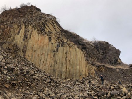 Базальтові стовпи вертикальні. Висота - метрів 15-20, а зверху ще стільки ж горизонтальних шарів. Поряд купа подрібненого базальту, тому блогер радить ходити обережно.