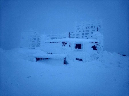 Станом на 08:00, 01.02.2021 на г. Піп Іван Чорногірський температура повітря -5°С, вітер південний 3 м/с., хмарно, туман, падає сніг.