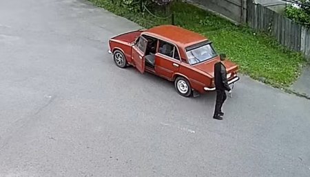На відео видно, як чоловік на червоному Жигулі зупиняється на одній із вулиць міста і викидує цуценя.