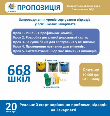 Також він наголошує, що далі необхідно буде закупити баки для сортування сміття у школах — це вартуватиме області приблизно 20 мільйонів гривень.