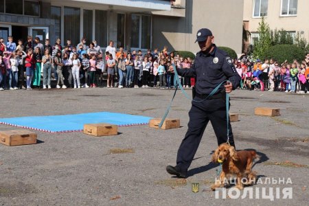 Кінологи показали, як їх чотирилапі помічники шукають заховані предмети. До таких пошуків залучили і дітей, дали понюхати песику річ школяра, а інший заховали на полі – за лічені хвилини службовий собака знайшов сховане взуття.