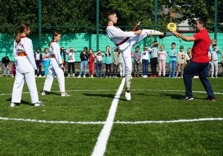 Після урочистостей учні школи одразу випробували нове покриття – зіграли короткий футбольний матч, провели тут і показові виступи чирлідери та спортсмени із тхеквондо.