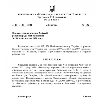 Однак із незрозумілих причин 17 червня 2021 року районна рада скасувала своє рішення про передачу об’єкта Вилоцкій ТГ.
