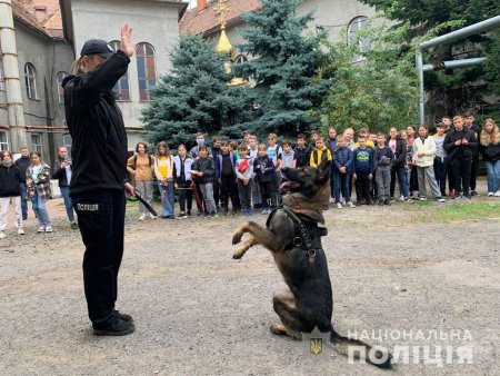 Також на учнів чекала зустріч із кінологами, які познайомили хлопців та дівчат зі службовою собакою — німецькою вівчаркою Келлі. Правоохоронці розповіли школярам про основні правила тренування службових собак, а після цього діти мали змогу поспостерігати, як вівчарка виконувала різні команди кінолога.