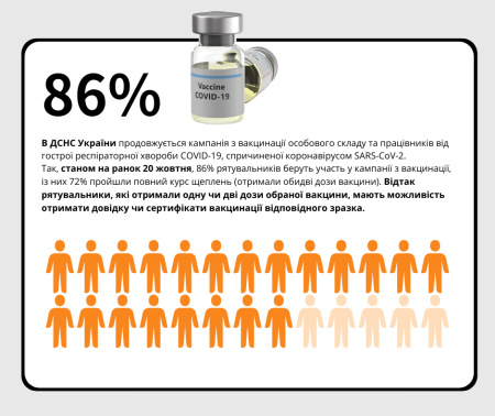 В ДСНС триває кампанія з вакцинації особового складу та працівників від гострої респіраторної хвороби COVID-19, спричиненої коронавірусом SARS-CoV-2. Особовий склад Служби порятунку усвідомлює важливість якнайшвидшого вироблення колективного імунітету проти коронавірусної хвороби, тому виявляє бажання вакцинуватися з метою подолання пандемії. Зокрема, станом на 20 жовтня, вже 86% рятувальників беруть участь у кампанії з вакцинації, із них 72% пройшли повний курс щеплень (отримали обидві дози вакцини).