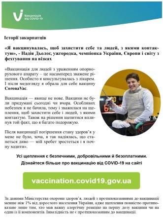Відома ужгородська спортсменка, чемпіонка України, Європи і світу з фехтування на візках Надія Дьолог вакцинувалася, щоб захистити себе та людей, з якими контактує.