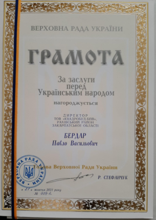 За ініціативи народного депутата України, Василя Васильовича Петьовки щодо нагородження найбільших платників податків у Рахівському районі, 23 грудня, на сесії Рахівської міської ради, міський голова Віктор Медвідь вручив почесну грамоту та медаль Верховної ради України директору ТОВ «Квадробуд-БПВ» Бердару Павлу Васильовичу за вагомий особистий внесок у соціально-економічний розвиток регіону, активну громадську позицію та високий професіоналізм.