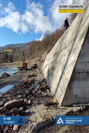 ✔ Завершуємо будівництво ще однієї низової підпірної стіни із монолітного бетону на автодорозі Р-21 Долина-Хуст. У селі Нижні Бистрий зводимо 468-и метрову стіну вздовж ріки Ріка.