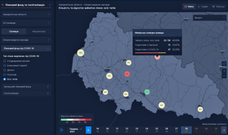 Згідно офіційної інформації РНБО України з посиланням на МОЗ в Закарпатті, завантаженість ліжок на короновірус складає 41.5 % відповідно 801 хворий та 64 з них підозри це другий негативний показник після Івано-Франківської області.