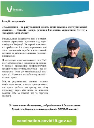 Речниця Головного управління ДСНС у Закарпатській області Наталія Батир поділилася своєю історією вакцинації проти коронавірусу.