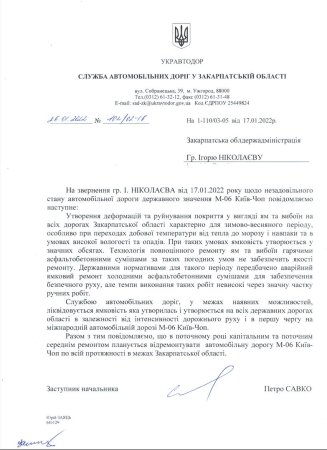 Один з водіїв Igor Nikolaiev на початку січня також пошкодив 3 колеса на трасі “Київ-Чоп” у напрямку Ужгорода. Він надіслав звернення до Служби автомобільних доріг в Закарпатській області, відповіддю на яке, поділився з громадськістю.